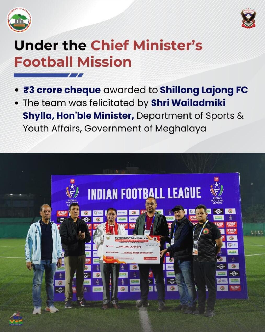 Shillong Lajong-in IFL stage 1 khar nan Aizawl FC 6-1 in an hneh a, point 17 hmuin pahnihna an ni. Meghalaya sorkar chuan Shillong Lajong hi IFL-a result ṭha tak an neih avangin Aizawl FC an hneh zawh hian CM Football Mission kaltlangin sports minister Wailadmiki Shylla-a'n nuai 300 a hlan.