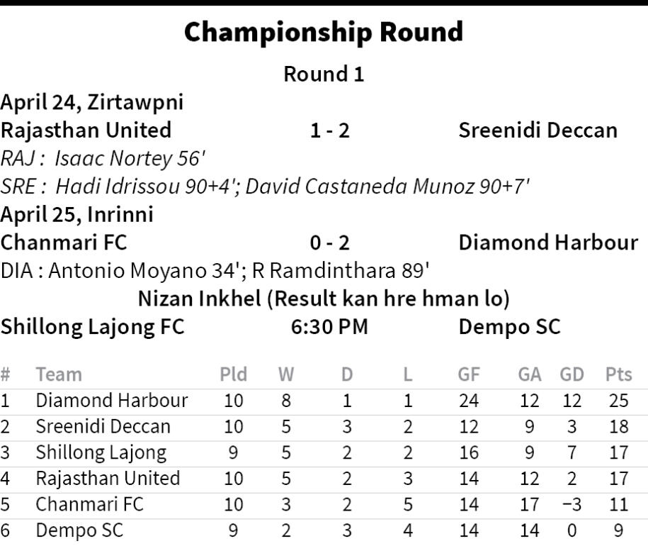 Table chunglama awm pathumin an mualah match thum an khel ang a, khualmualah match hnih an khel ang. Chanmari erawhin panganaa stage 1 an khar avangin an mualah match hnih chauh an khel dawn a, May 9, Inrinni zan hian Dempo SC an mikhual leh ang. Hemi hma hian Mizo club hian Shillong Lajong an tlawh dawn a; May 2, Inrinni hian Shillong-ah NorthEast Derby khelh a ni ang.