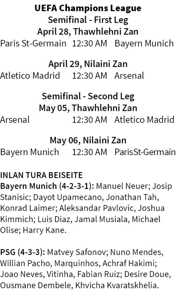 Football ngainatute tan men rei zan a thleng leh ta - Paris Saint-Germain chuan zanin dar 12:30 hian Champions League semifinal first leg-ah Bayern Munich an mikhual dawn a, ennawm ropui en turin inpeih rawh le.