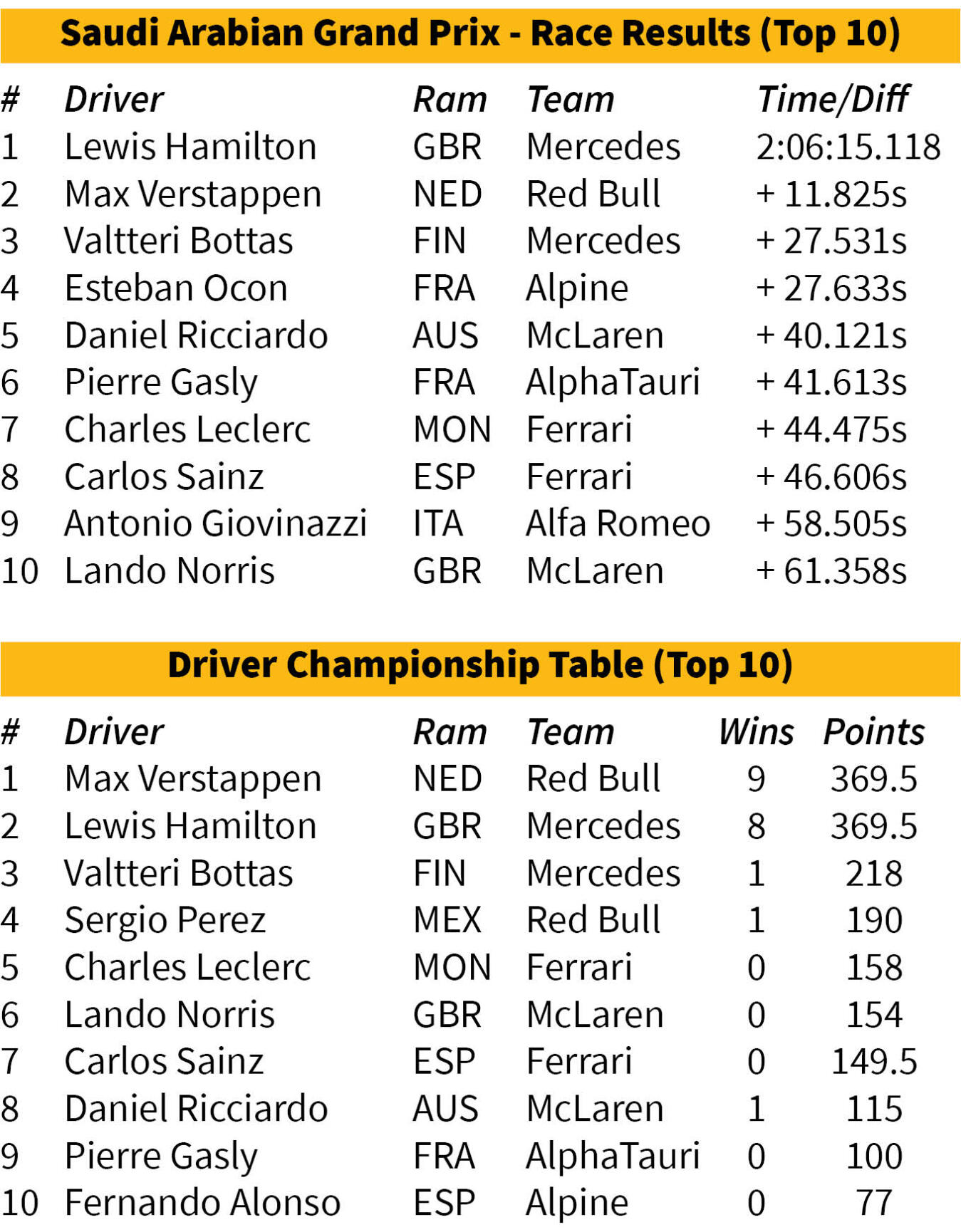 Formula 1 intlansiaka hmuhnawm awm thei tur zawng zawng chhawpchhuah a ni a, tawnhriat nei ṭha leh driver huaisen Lewis Hamilton-a'n Saudi Arabian Grand Prix-ah hnehna a chang.