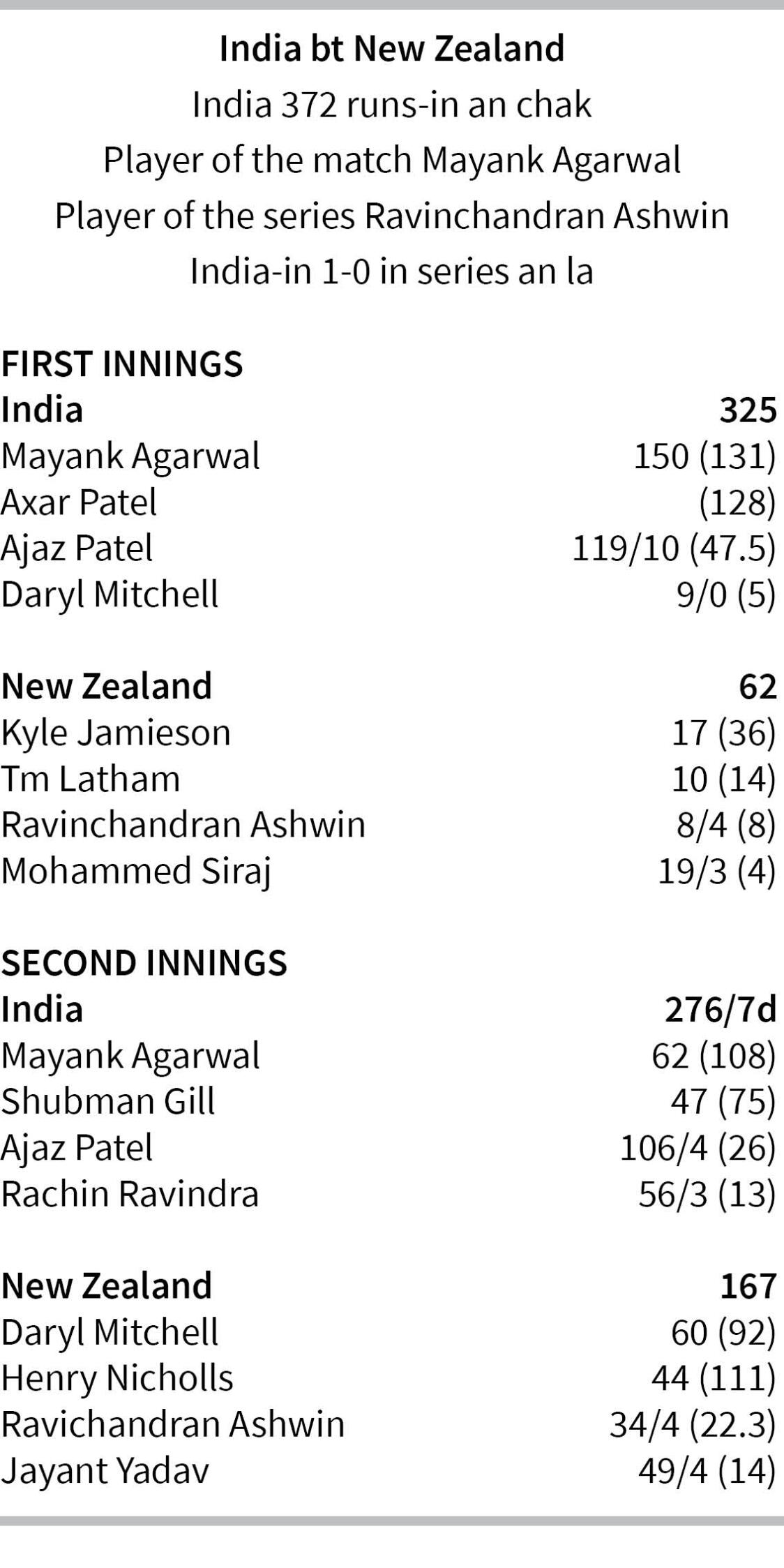 New Zealand left arm spinner Ajaz Patel chuan wicket 10 a la a, Test innings khata wicket la vek thei pathumna a ni. Agarwal zarah India dinhmun a ṭha a, India bowler-te an chet ṭhat zui avangin first innings zawhah chak tur chiangah an ngaih theih.