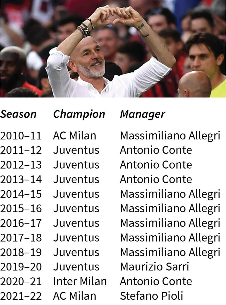 Milan champion puitu Massi-miliano Allegri-a'n Juve ṭum nga a champion pui a, season liam taa Inter Milan champion puitu Antonio Conte pawhin Juve ṭum thum a champion pui. Tun ṭuma Milan champion puitu Stefano Pioli erawh 2019–20 season-a Juve champion puitu Maurizio Sarri ang thoin manager a nih hnua Scudetto a chawi hmasak ber a ni.