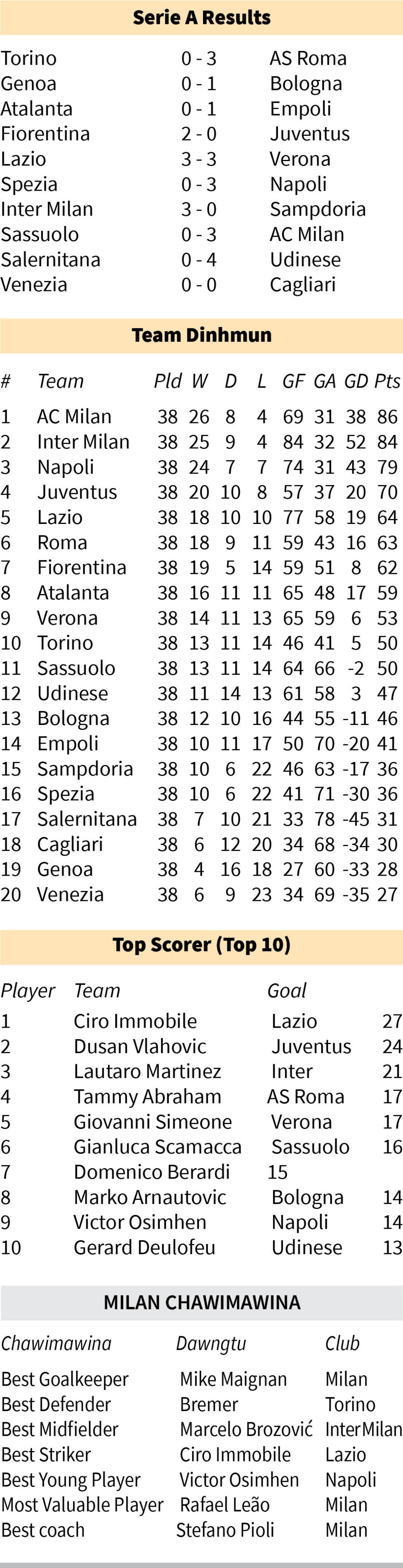 Stefano Pioli enkawl AC Milan hian Sassuolo 3-0 in an hneh a, league match 38 aṭanga point 86 hmuin an chungnung ber. An hmelma leh elpui Inter Milan aiin point hnihin an sang zawk, champion nomawi an chhuhsak nghal bawk.