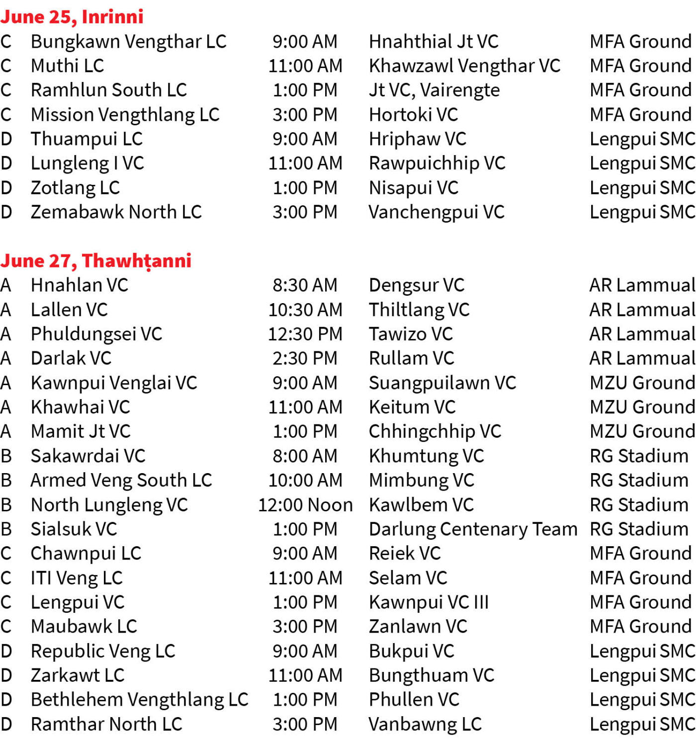 Vawiin hian MFA Ground (Sairang) leh Lengpui SMC-ah chauh inkhel a awm dawn. Sairangah Aizawl khaw pawn aṭanga team ṭha zinga mi Hnahthial Joint VC te an inlan ang. Hnahthial hi Mizo footballer zinga thleng sang ber Jeje Lalpekhlua te khua a ni a, footballer ṭha an kawl tam bakah artificial turf an neih tawh bawk avangin an ṭha tura ngaih an ni.