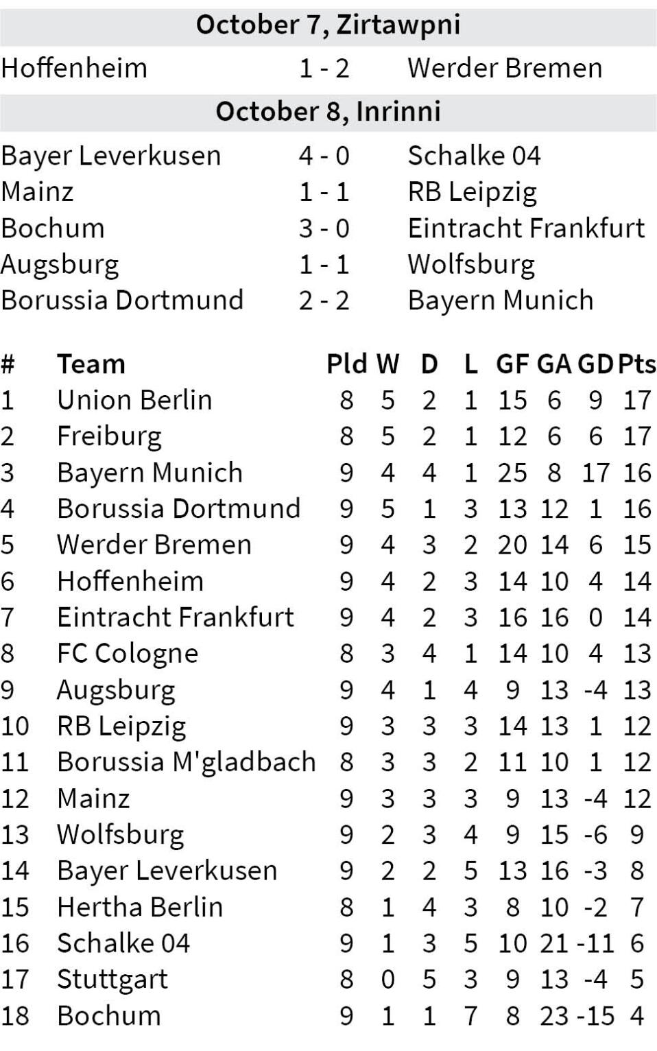 Bayern leh Dortmund te hian point 16 ve ve an hmu a, pathumna leh palinaah an awm chhunzawm. Nizan khan hmahruaitu Union Berlin-in Stuttgart an hmachhawn a, pahihna Freiburg-in Hertha Berlin an tlawh bawk - result kan hre hman lo.