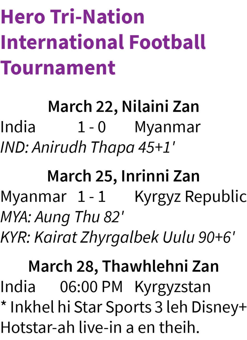 India hian an match hmasa zawkah Myanmar chu 1-0 in an hneh tawh a, zanina an hmachhawn tur Kyrgyz Republic hian Myanmar hi an inhnehtawkpui avangin India tan nomawi chawi turin draw a tawk.