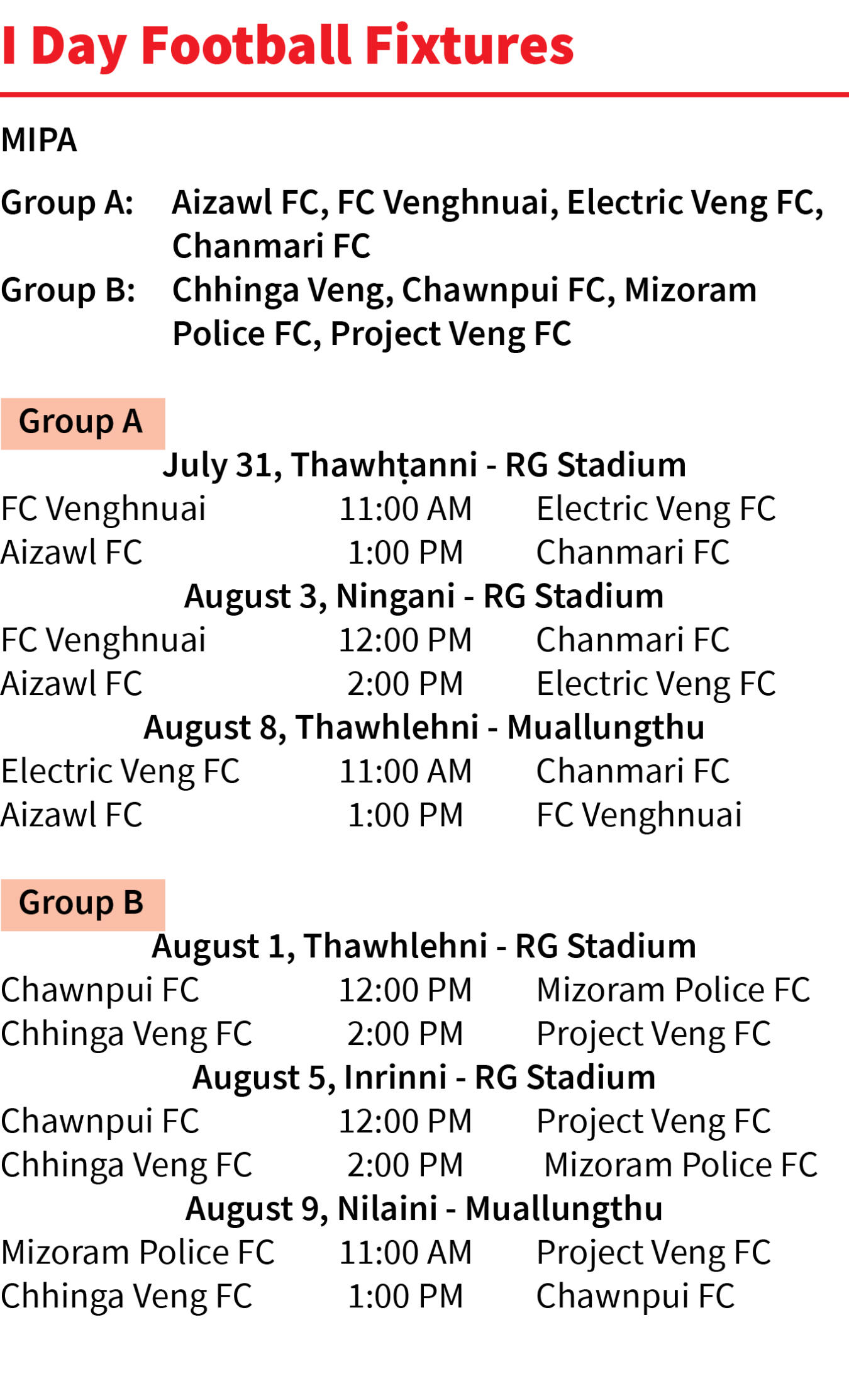 Mizoram Football Association chuan nimin khan I Day Football fixtures an tichhuak a, champion lai Mizoram Police chu MPL champion Chawnpui leh coach Lalsangzuala Hmar enkawl Chhinga Veng te nen group khatah an dah. Group B-ah hian MPL kai thar Project Veng FC an awm bawk.