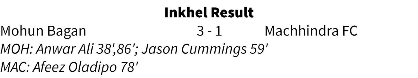 Bagan tan defender thar Anwar Ali chuan goal hnih a khung a, Jason Cummings chuan goal khat a thawh bawk - Nepal club tan Afeez Oladipo chuan goal khat khung ve mah se awmzia a nei phak lo a, a tawpah 3-1 in Bagan an chak.