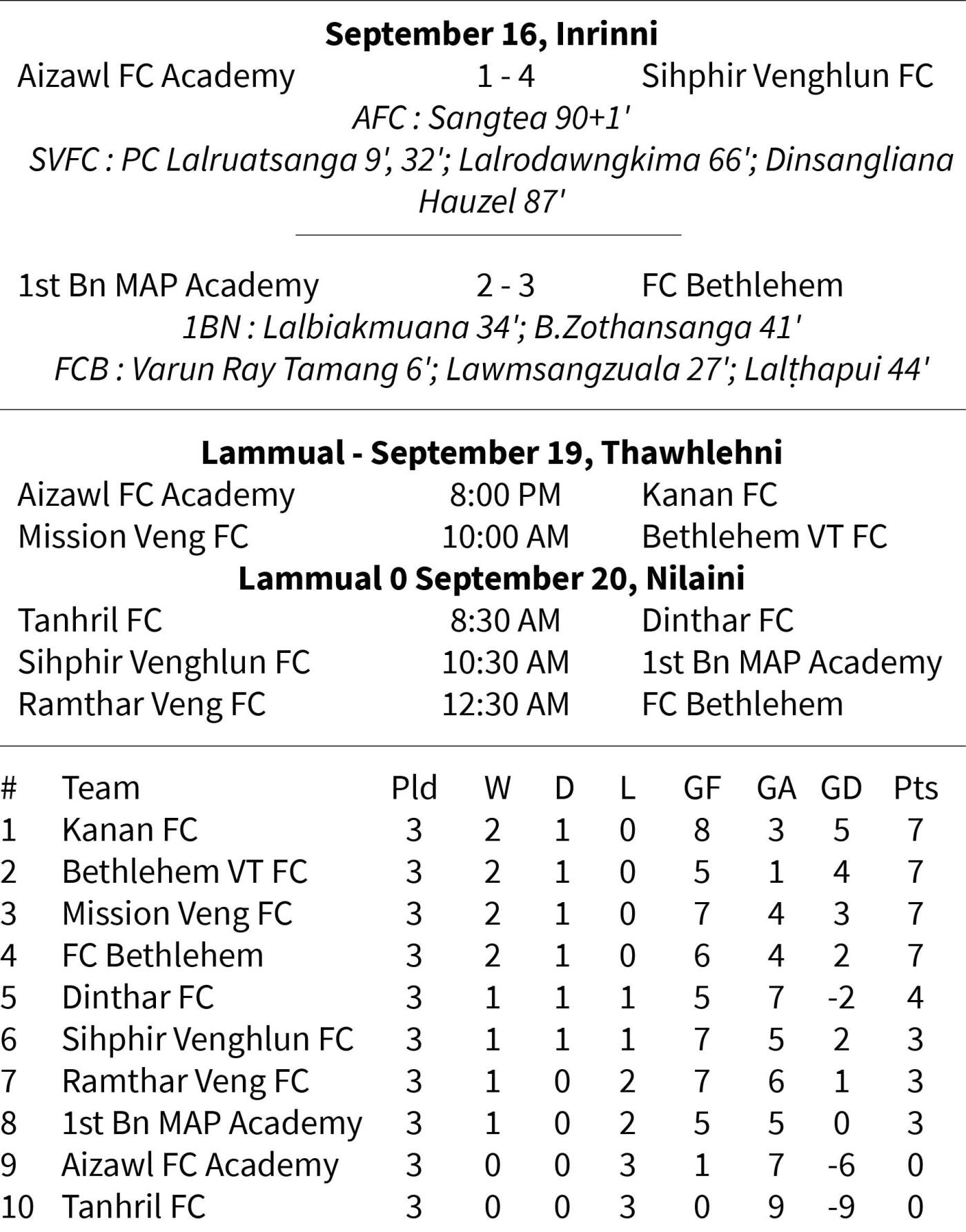 Aizawl DFA First Division-ah hian team 10 an awm a, vawi khat ṭheuh an inkhelh kual hnuah a sang paliin semifinal an khel dawn. Kanan FC-in hma an hruai mek a, chutihrualin Bethlehem VT FC, Mission Veng FC leh FC Bethlehem ten Kanan ang thoin point sarih vek an hmu tih hriat a ṭha.