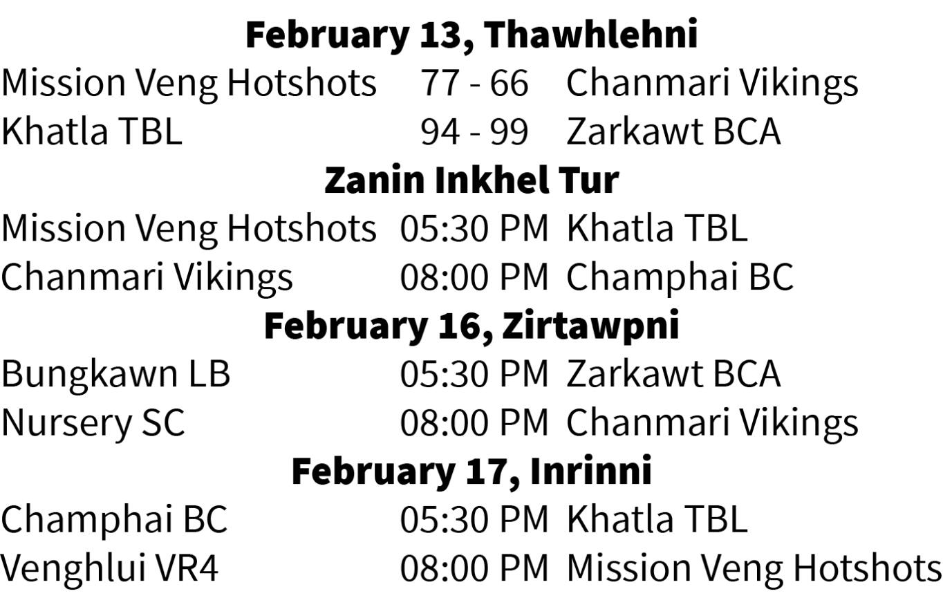 Match hmasa berah chak lo mah se TBL hi an chhe ta duai tihna a la ni lo, tualchhung player ṭha Ṭhazuala an la nei a, ani leh Keyes hi an inkawp rem chho leh a nih chuan champion pui tham an ni thung - zanin dar 5:30 hian Mission Veng Hotshots nen an inkhel leh ang. Inkhel dangah Hotshots hian Chanmari Vikings chu 77-66 in an lo hneh ve thung a ni.