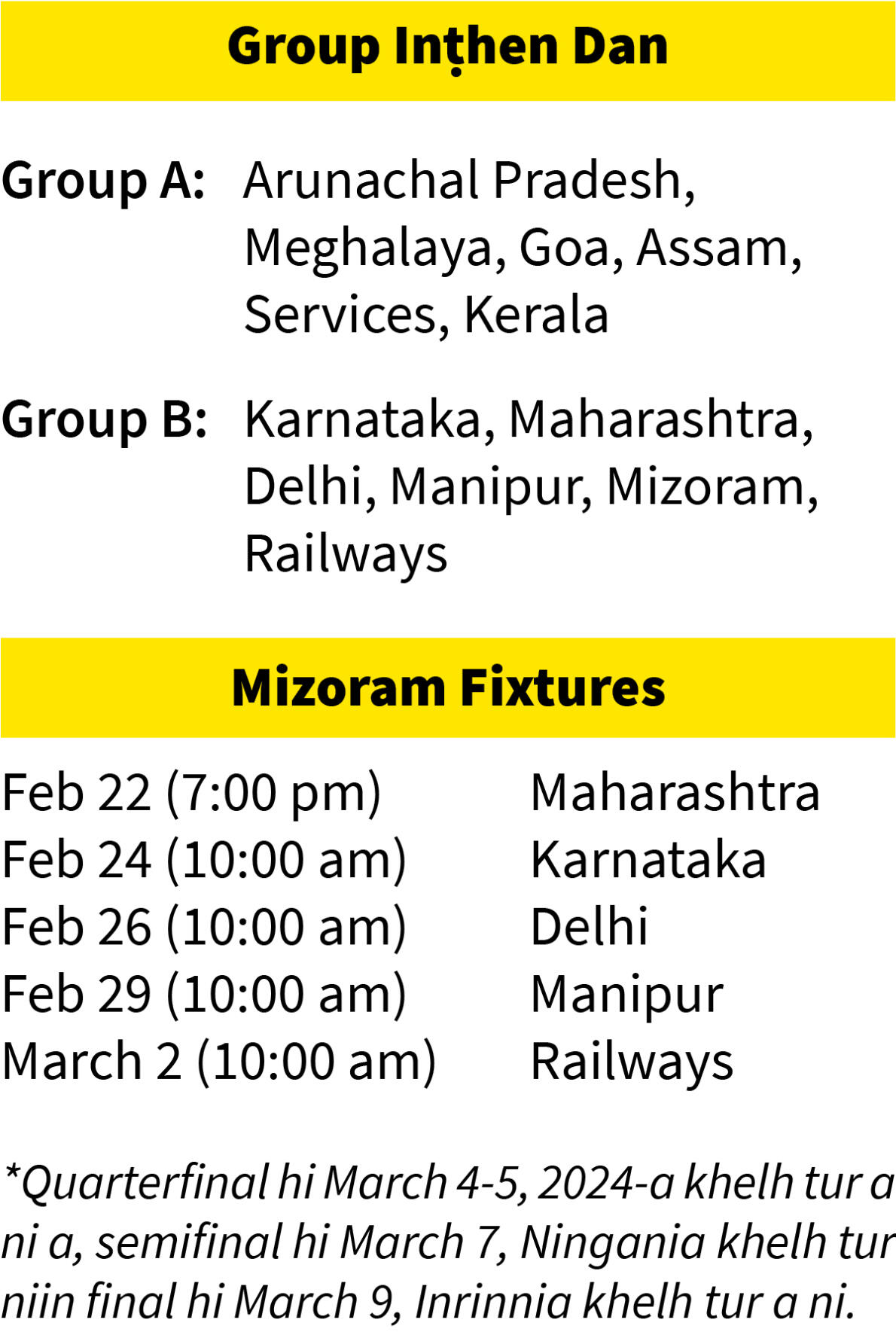 Mizoram team hian February 18, Pathianni hian Aizawl chhuahsanin inelna hmun Itanagar, Arunachal Pradesh an pan ang. Inelna hi February 21, Nilaini aṭanga ṭan tur a ni a, Mizoram hian match hmasa berah Maharashtra chu February 22, Ningani zan dar 7:00-ah an hmachhawn ang.