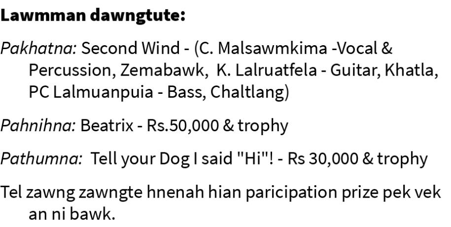 Beat contest endiktute hi Zohmingthanga (Hmingpuia- Albatross) Zarkawt, HS Lalruatliana (Booma- Boomarang) Chanmari, Peter Zohmingthanga, Chanmari leh Zothanmawia (Mystique) Khatla te an ni.