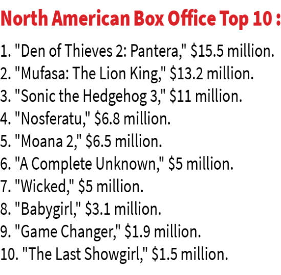North American box office-ah 2018 heist thriller sequel, Gerald Butler channa 'Den of Thieves 2 : Pantera' chuan tlangzarh karah USD mtd 15.5 la lutin a chung ber dinhmuh a hauh. Nikum November thla hnua Liongate film in No 1 a hauh lehna hmasa ber a ni.