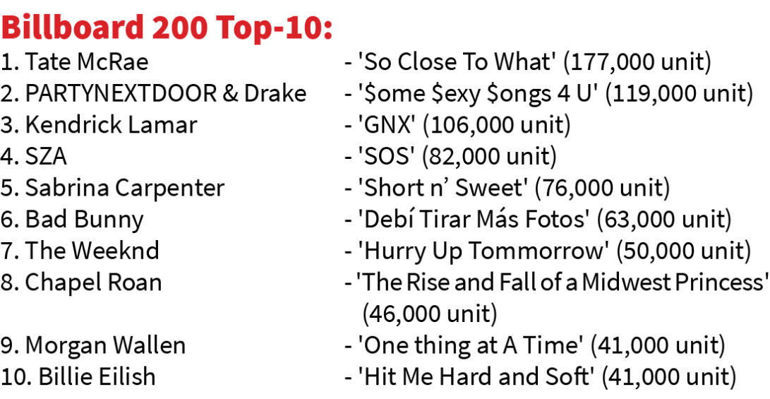 Billboard 200: No.1-ah Tate McRae a rawn lang