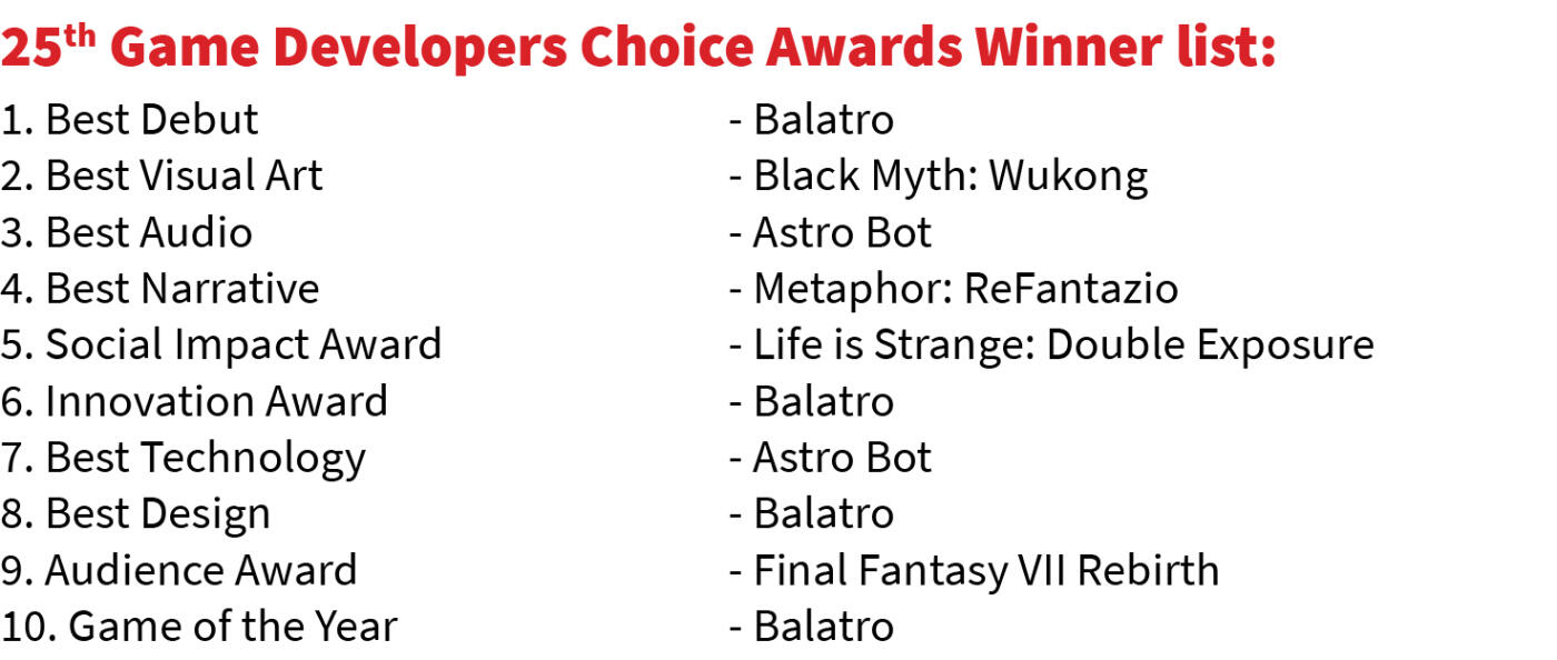 Game Developers Choice Awards(GDCA), vawi 25-na chu San Francisco-a Moscone Convention Center-ah Nilaini khan sem a ni. Kumin GDCA semnaah hian award ngaih hlut hlawh ber Game of the Year Award chu LocalThunk leh Playstack-te siam Balatro games-in a dawng a, hei bakah hian award dang pathum a dawng tel bawk. Award hi category 12 atangin sem a ni.