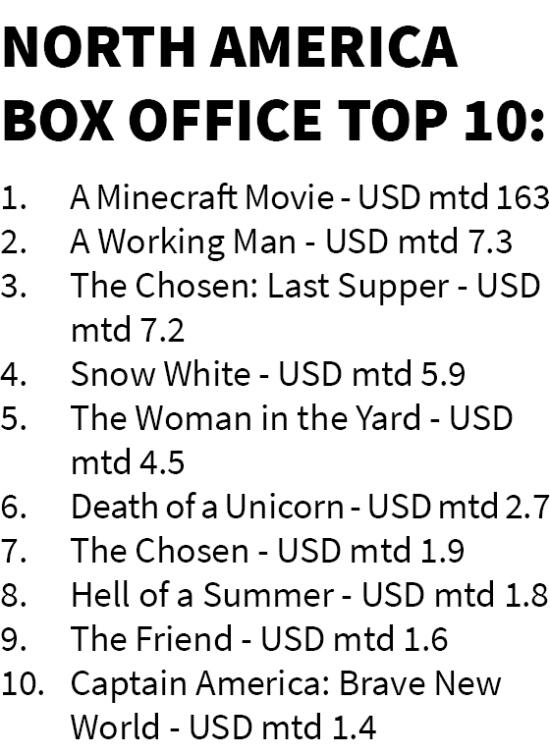 North American Box office chart thar berah, Warner Bros. Legendary Pictures siam 'A Minecraft Movie' chuan record siamin, ram chhungah USD mtd 163 zet la lutin, ram pawnah USD mtd 150.7 a la lut a, a kar khatnaah khawvel pumah USD mtd 313.2 a la lut nghal.
