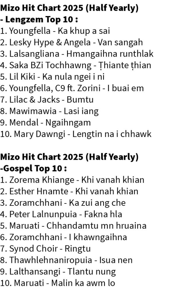 Zo Event Organisation chuan kumin January 1- June 30 chhunga Mizo hla, YouTube-a music video view ngah zualte hnenah Ningani zan khan award a hlan. Hemi zan hian Dinsanga, World Boxing-a champion medal la leh Vanlalnuntluangi Miss Grant India 2025-a 1st Runner up te chawimawina pek an ni bawk.