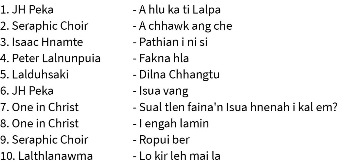GIG Motors Gospel Ṭhazual chart tharah JH Peka 'A hlu ka ti Lalpa' chu pahnihna aṭangin pakhatnaah a kaisang ta. A hla hi hun eng emaw chen chart-ah hian a lan pui tawh a ni.