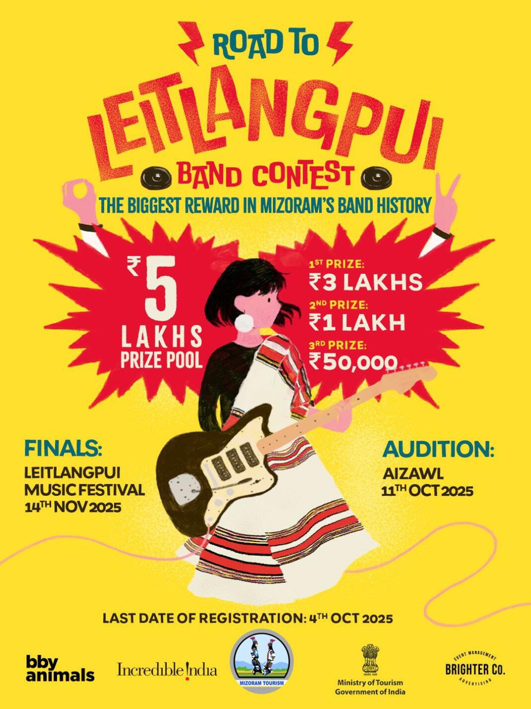 Mizorama beat contest awm tawha pawisa fai dawn theihna sang ber tur, 'Road To Leitlangpui Band Contest' audition round hi October 11-ah The Warehouse Cafe, Folkland- ah neih tum a ni a, finalist thlan an ni ang. Registration hi October 4 thleng a tih theih a ni. Leitlangpui Music Festival ni hnihna zan lamah final neih a ni dawn a ni. Band tel tur tam zawk hi Aizawl District leh Mizoram pawn lam band an nih avangin, audition round hi Aizawla neih tura ruahman a ni. Pakhatna hian lawmman, pawisa fai Rs nuai 3 an dawng dawn a, pahnihna in Rs nuai 2 leh pathumnain Rs 50,000 an dawng bawk ang.