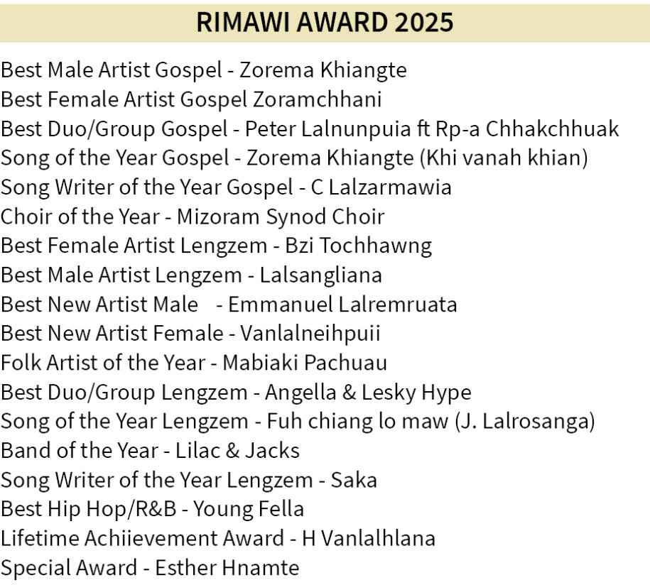 Mizo Zaimi Inzawmkhawm (MZI) chuan nizan leh zan hmasa Ningani zan khan Rimawi Award 2025 an sem a, Zorema Khiangte-in award pahnih a dawng.