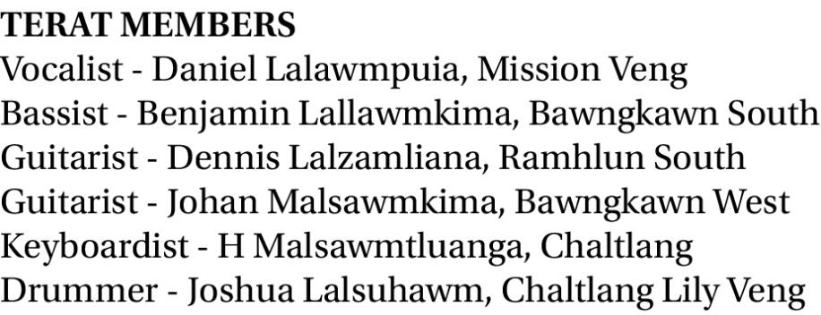 Darjeeling Melotea Fest 3rd Edition, Inrinni liamta zana D-Rock English Band Competition-ah Mizo band - TERAT chu pakhatna an ni. He intihsiakna final competition-ah hian band pakua an intihsiak a, TERAT hi pakhatna niin, lawmmanah Rs 8,00,000 an dawng a ni.