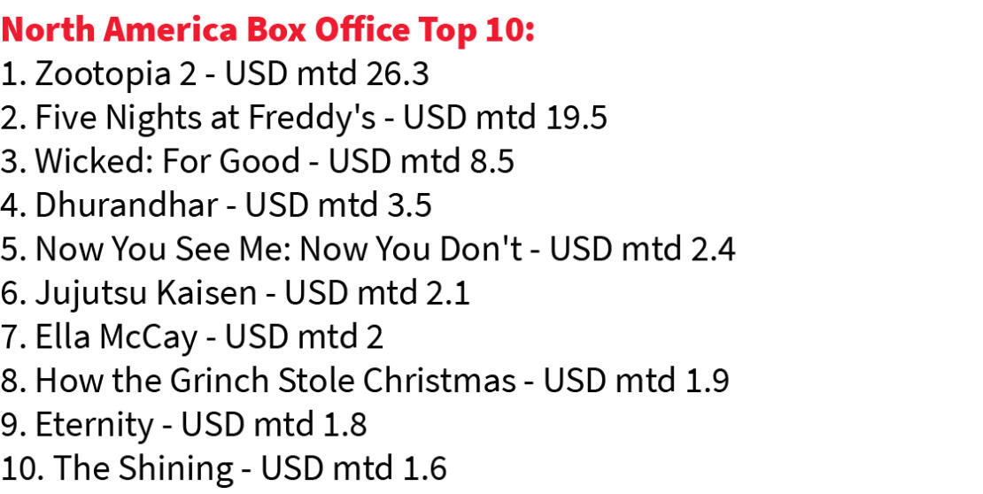 North American Box Office chart tharah, chart hmasaa pahnihna 'Zootopia 2' chuan USD mtd 26.3 lak luh belhin No.1 ah a kir leh. Film hian ram chhungah USD mtd 259 la lutin, tlangzarh a nih aṭanga ni 20 hnuah khawvel pumah USD tld 1.13 a la lut tling tawh. 'Zootopia 2' hi kumina Hollywood film tlangzarh zinga sum la lut hnem ber a ni bawk.