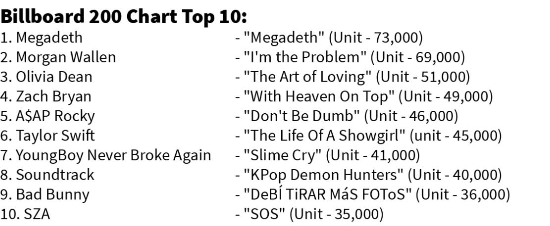 American Heavy metal band chuai thei lo, Megadeth chuan kum 40 dawn hnuah an album thar an band hming chawia siam 'Megadeth' tih chu No.1-ah an lanpui a, an album zinga chart-a No.1 ni thei hmasa ber a ni. Kum 1992-a album an tihchhuah "Countdown to Extinction" kha chart-ah hian pahnihna an thlenpui thei bawk. Megadeth No.1 nih kar hi No.1 ni thei in album unit a neih tlem ber ṭum a ni.
