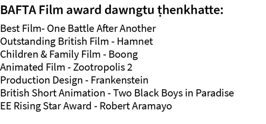 Kumin BAFTA-ah hian American black comedy action-thriller, 'One Battle After Another' a che ṭha hle a, award paruk dawngin best film leh best director award a dawng tel. Ryan Coogler film 'Sinners' chuan award pathum a dawng bawk. Biographical period film 'Hamnet' chuan outstanding Bristish film dawngin, he film-a changtu ber Jessie Buckley chuan best actress a dawng bawk.