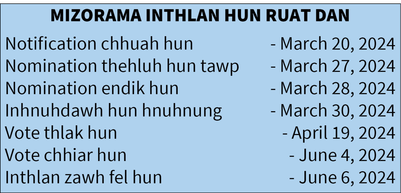 Election Commission of India (ECI)-in a ruahman dan chuan, Mizorama Lok Sabha inthlan turah hian March 20-ah notification chhuah a ni dawn a, inthlan chuh tum (candidate)-te tan March 27 thleng hming pek luh theih niin, nomination-te chu March 28-ah endik a ni ang.
