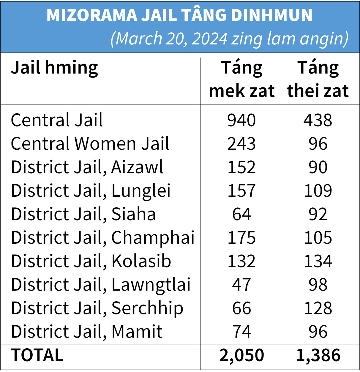 Mizorama jail hrang hrangah nimin zing thleng khan táng mi 2,050 an awm a; Mizoram jail-a táng thei zat tura bituk chu mi 1,386 niin, awm thei zat bituk aiin 664-in an tam zawk mek.