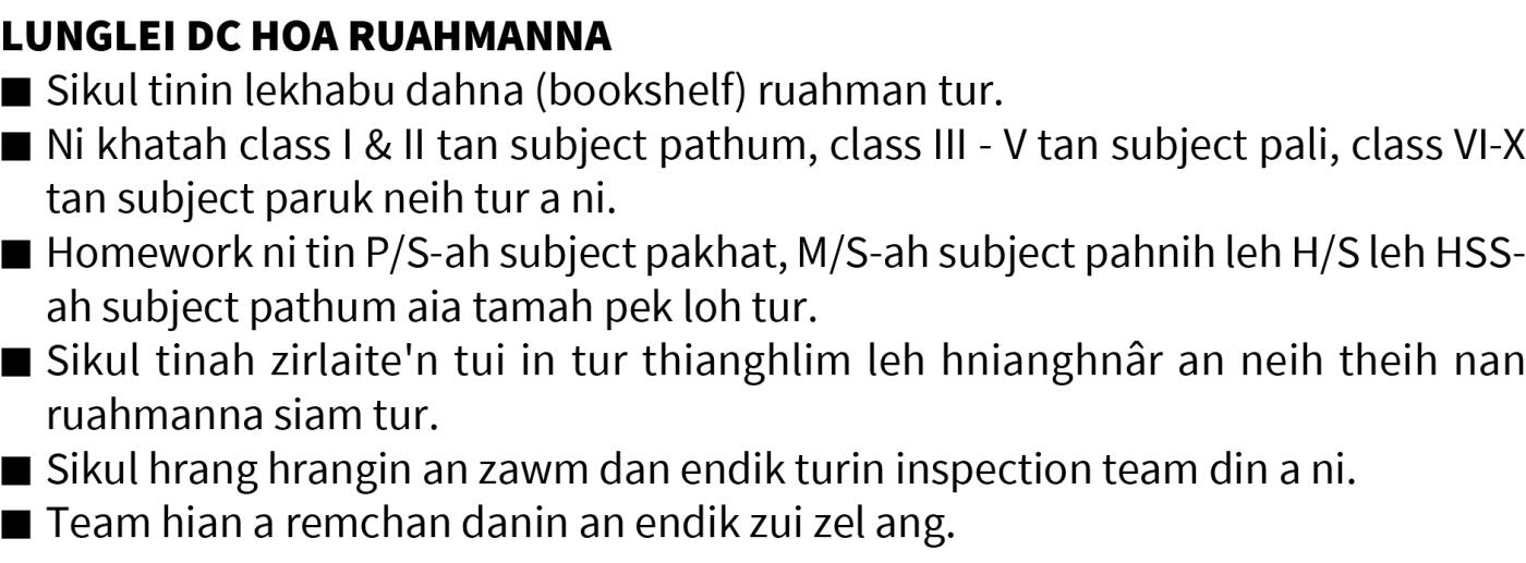 Inspection team hian Lungleia Baptist Higher Secondary School, Baptist English School, Pukpui Middle School leh JNM Middle School-te an tlawh a; sikulah lehkhabu riahna tur bâwm (locker/shelf) a awm leh awm loh te, ni khata subject neih zat leh home work neih zat te, sikula tui thianghlim in tur a awm leh awm lohte an endik a, sikul naupangte ip rih zawng an teh bawk.