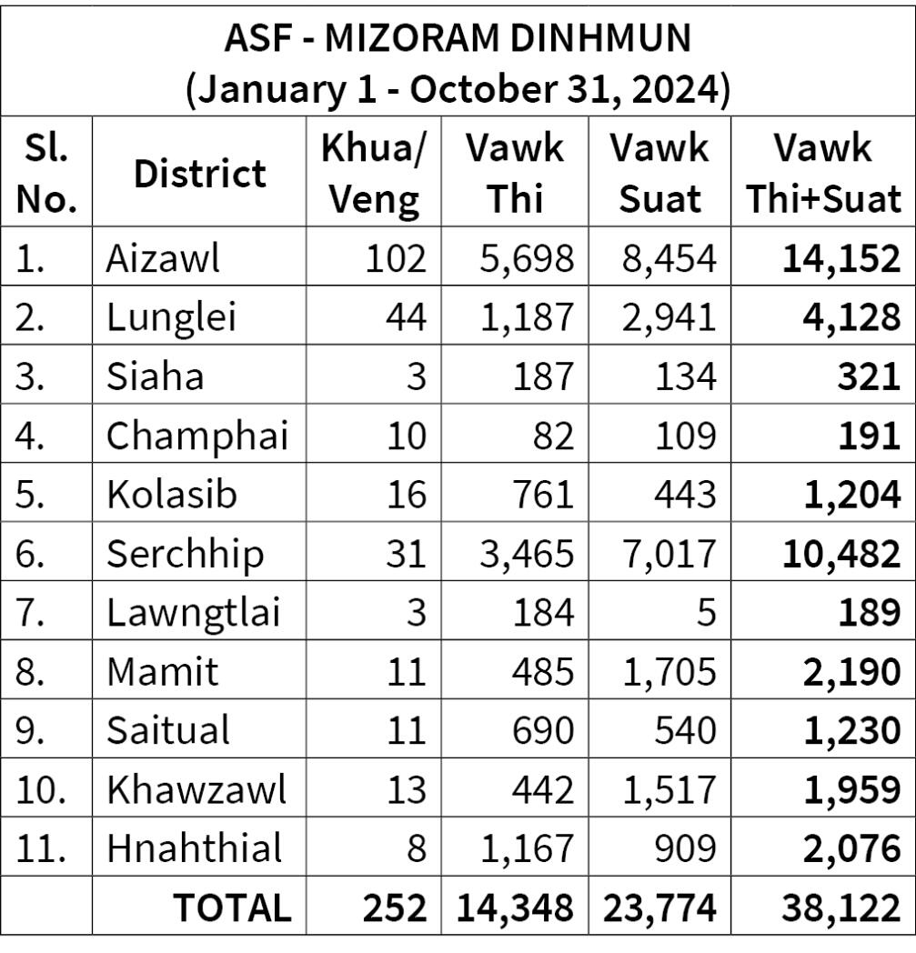 Kuminah January 1 aṭanga October 31, nimin thleng khan Mizorama khua/veng 252-ah ASF vanga vawk thi leh suat 38,122 a awm tawh a, chu'ng zinga 14,348 chu hri vanga thi a ni. October 30, Nilaini bikah khan district pahniha khua/veng pathumah ASF vangin vawk pakua a thi a ni.