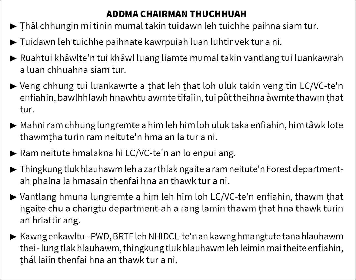 ADDMA Chairman chuan, Aizawl district-a khua/veng tina village/local disaster management authority-te chu thuchhuah zawm a nih leh nih lohte enfiah a, a zâwm lote chu District Disaster Management Authority hnenah hriattir turin a chah a; thuchhuah zâwm lote chu DM Act, 2005 hnuaia hrem theihna dan hmangin hrem theih an nih thu a tarlang.