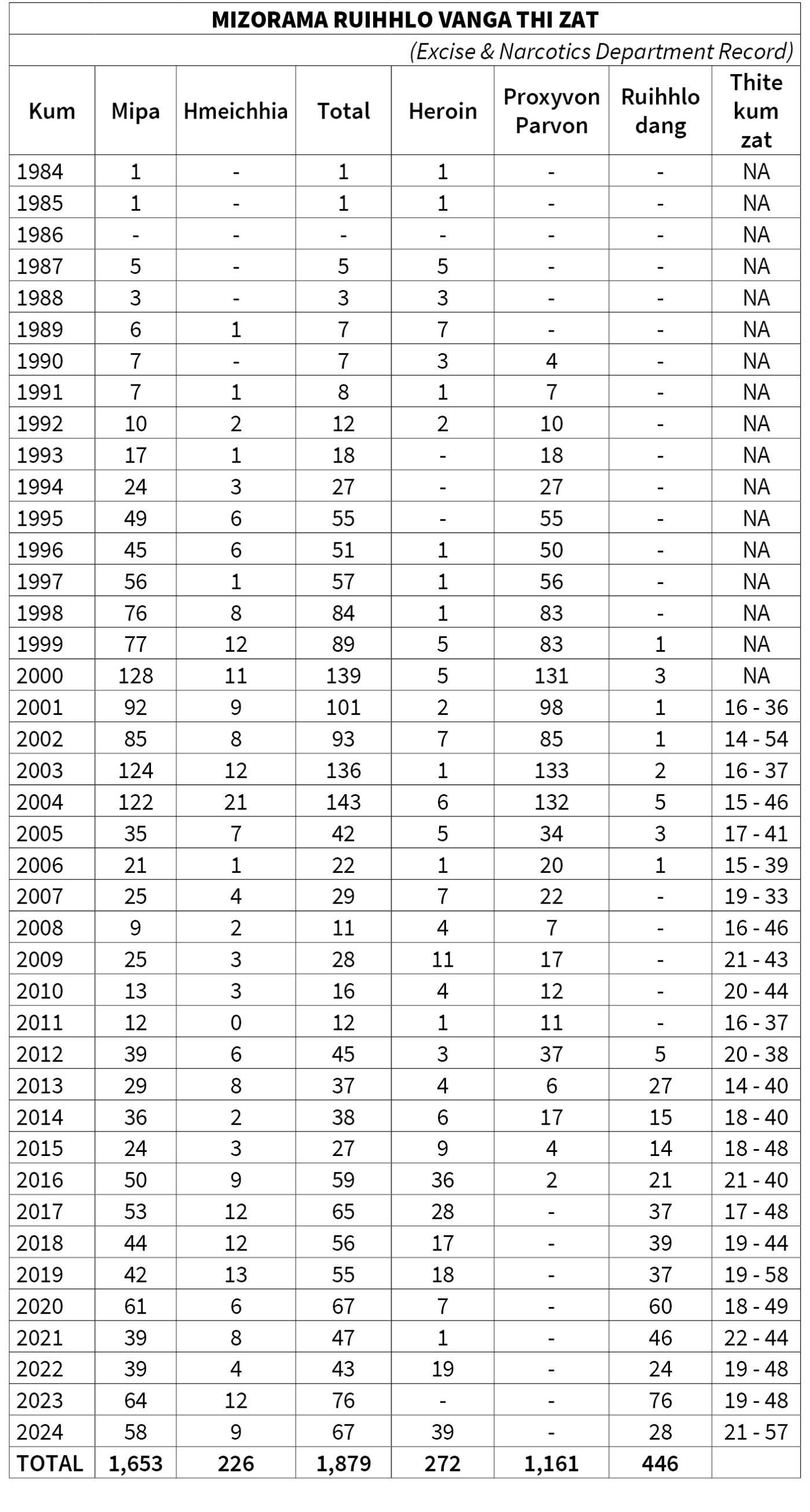 END chhinchhiah danin, kum 2024 chhunga ruihhlo vanga thi mi 67-te chu mipa 58 leh hmeichhia pakua an ni a, kum 21 leh 57 inkar an ni. Mi 67 zinga 39 chu heroin ti ṭhin an ni a, mi 28 chu ruihhlo dang ti an ni thung.