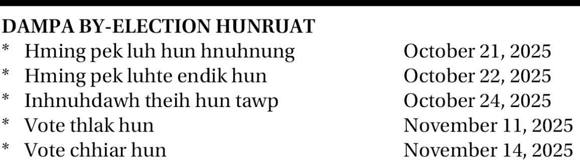Election Commission of India (ECI) chuan Dampa assembly constituency by-election neih hun tur chu November 11, 2025 a ni tih a puang.