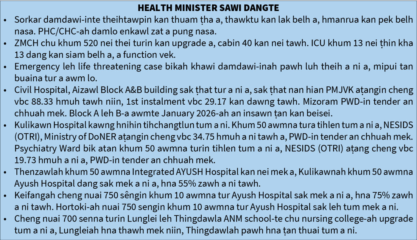 Health minister Lalrinpuii chuan, Mizoram Universal Healthcare Scheme (MUHCS) hnuaiah nimin thleng khan mi 59,602 enkawlna atan sorkarin cheng vbc 100.52 a sên tawh thu a sawi a; MUHCS chu Aizawla mimal damdawi-in ṭhenkhatte pawhin an zawm thar dawn thu a sawi bawk.