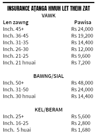 Mizoram sorkarin National Insurance Company (NIC) thawhpuia ran vulhtute'n an ran vulhte an thih palha sum an hmuh theihna tura a ruahman, Animal Insurance chu March thla chawhnu lam aṭangin a taka kalpui theih beisei a ni. Insurance hi ran vulhtute'n dik thlapa an dil (claim) a, NIC-in ni 15 chhunga an tifel hman lo a nih chuan an pawisa pek tur 12%-in a pung dawn.