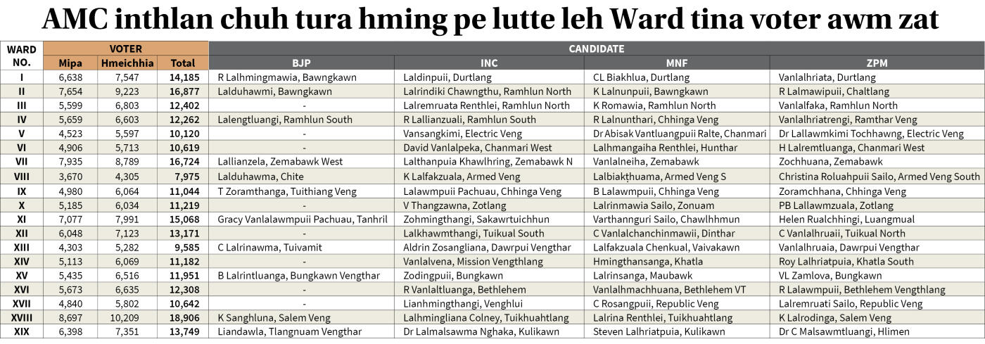 April 21, 2026-a Aizawl Municipal Corporation (AMC) inthlan chuh tura hming pe lut zingah corporator kal chhuak chiah mi pasarih leh MLA inthlana ding tawh mi pahnih an tel.