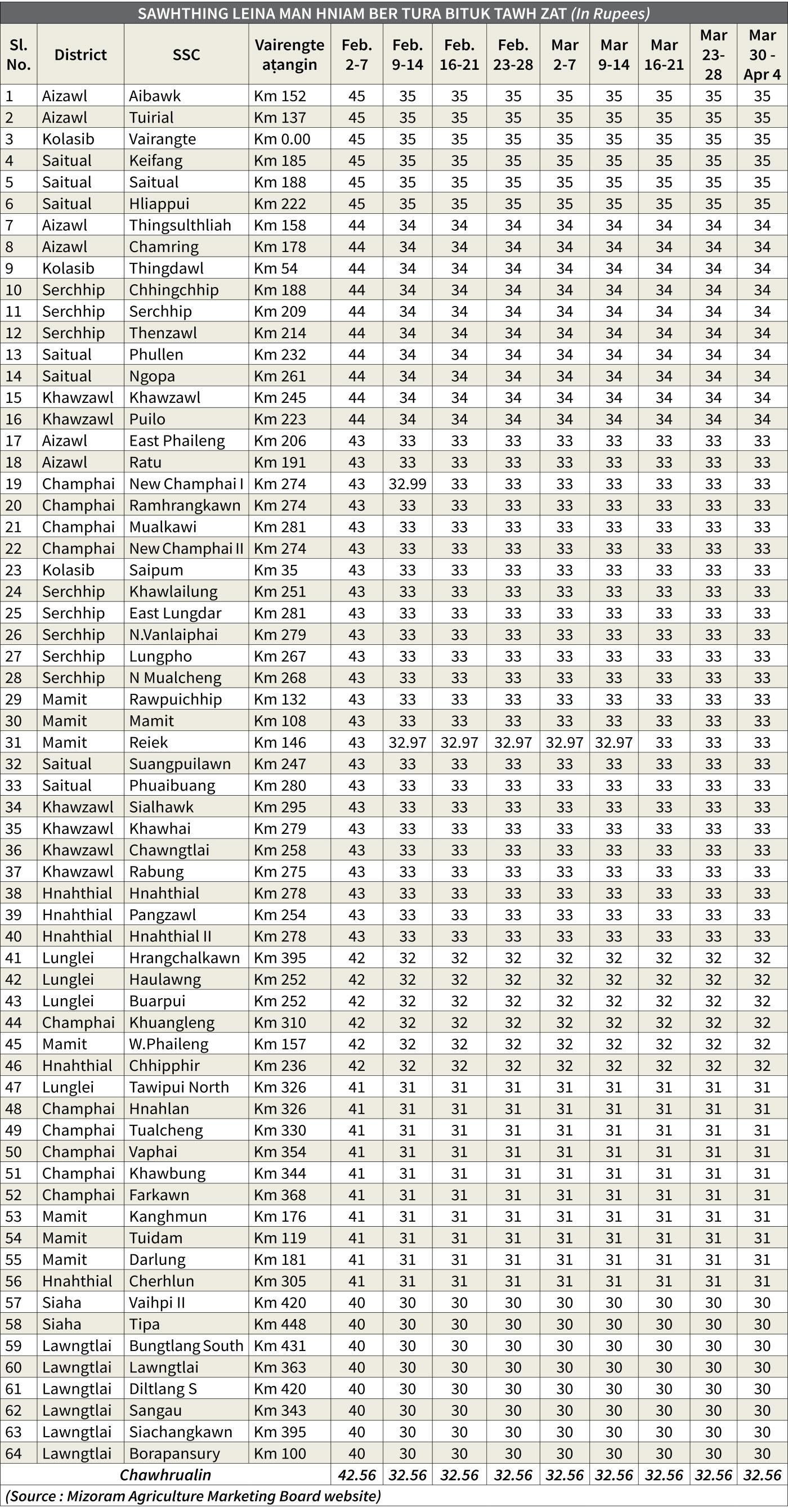 Mizoram sorkarin society-a inziaklut kut hnathawktute hnen aṭanga sawhthing lei ṭan hun tura a ruat - February 2, 2026 aṭanga nimin thleng khan secondary collection centre (SCC) 64-a sawhthing man tur chu kar tin a bituk a; tunah hian SCC 64-ah chawhrualin kg khat Rs 32.56 niin, kar 8 chhung a zâwnin Rs 32.56 hi hman a ni tawh.