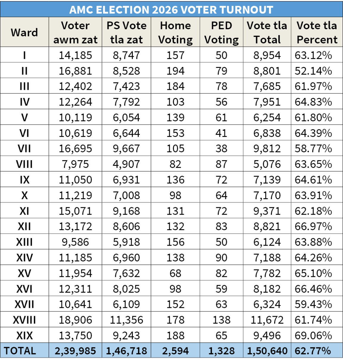 AMC inthlanah hian vote 2,39,985 awmin, vote 1,50,640 (62.77%) a tla. Vote chhiarna atan hian counting hall pali siam a ni. Counting hall no. 1-ah Ward-I, Ward-II, Ward-III, Ward-IV leh Ward-V chhiar a ni dawn.