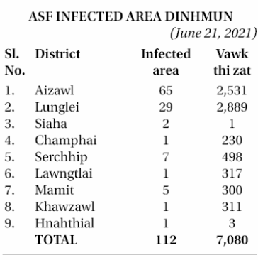 Animal Husbandry & Veterinary department chhinchhiah danin, Mizorama ASF infected area puan tawhna district pakuaa khua/veng 112-ah vawk 44,383 vulh a ni a, chu'ng zinga 7,080 chu ASF vangin a thi tawh a, vawk dam 37,220 a la awm.