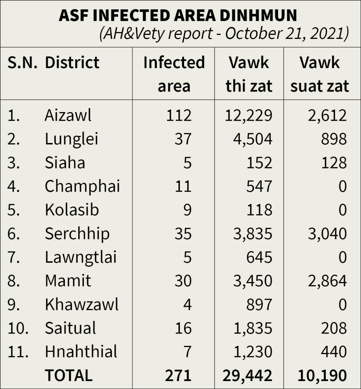 Nimin thleng khan ASF lênna nia rinhlelh khua/veng pasarihah vawk 190 suat a ni tawh a, ASF infected area-a vawk suat tawh 10,190 a ni, Mizorama vawk suat tawh zawng zawng chu 10,380 a tling.