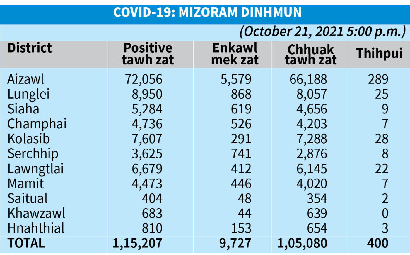IDSP record angin, Mizoramah Covid-19 vei 1,15,207 hmuh chhuah a ni tawh a, mipa 56,280 leh hmeichhia 58,927 an ni. Nimin tlai dar 5 thleng khan mi 1,05,080 (91.21%) chhuahtir an ni tawh a, mi 400 (0.35%) thi tawhin, enkawl mek mi 9,727 (8.44%) an awm.