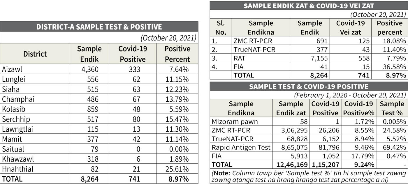 October 20, Nilaini khan Mizoramah Covid-19 vei mi 741 hmuh chhuah a ni. Nimin khan hripui vei dam tawh mi 532 chhuahtir an ni a, Nilaini zan leh nimin khan mi 5 an thi. Mizoramah Covid-19 positive 1,15,207 hmuh a ni tawh a, chu chu kum 2011 chhiarpuia Mizorama mihring awm zat 10,97,206 aṭangin 10.50% a tling.