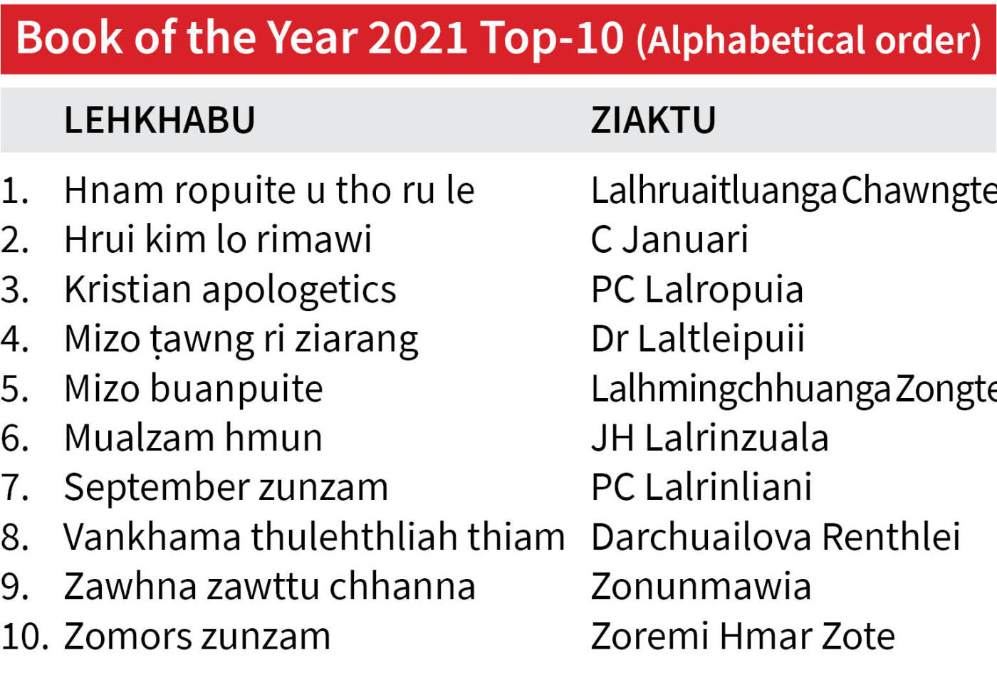 Mizo Academy of Letters (MAL) chuan kum 2021 chhunga Mizo irawm chhuak lehkhabu chhuak zinga ṭha ber a thlanna kal mekah a ṭha zual 10 an thlang tawh a, nimin khan an tichhuak.