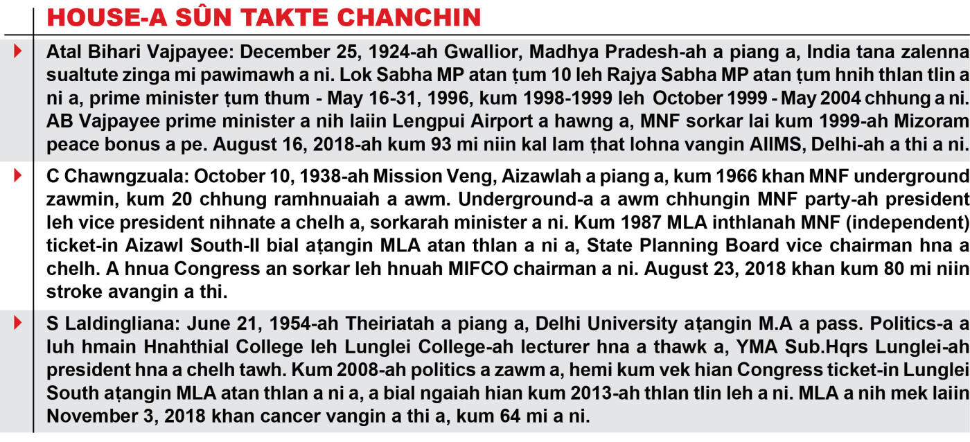 Nimina session ṭan a nih veleh tun ṭum session leh session hnuhnung ber inkara MP leh MLA thi mi pathum - prime minister hlui Atal Bihari Vajpayee leh MLA hlui pahnih C Chawngzuala leh S Laldingliana te sûnna hun hman a ni a; S Laldingliana hi MLA a nih laia thi a ni.