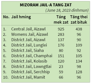 Mizoramah jail 10 a awm a, chu'nga táng awm thei zat tura bituk chu mi 1,386 an ni. June 18, 2023 (Pathianni) khan jail-ah táng 1,988 an awm thung a, tang awm thei zat tura bituk aiin mi 602-in an tam zawk.